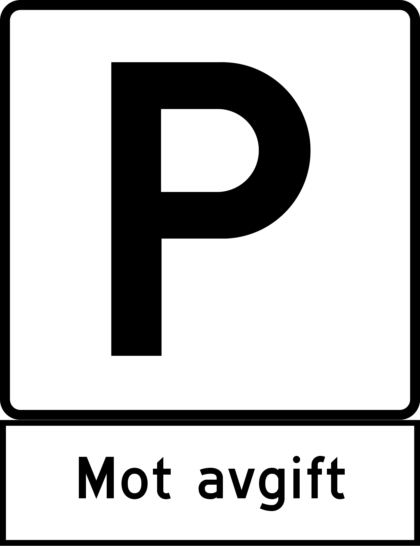 Parkeringsplasser åpne for alle som ligger utenfor ferdselsåre skiltes med vedlegg 1-skilt. Sort P på hvit bakgrunn.